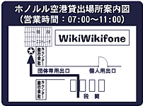 貸出・返却場所は、ホノルル空港、オアフ島内ホテルになります。但し、営業時間内にお願いいたします。空港営業時間外(11:00AM〜翌7:00AM)の貸出・返却は、ホテルまたはツアーデスクになります。ホノルル空港での貸出場所は右図をご参照ください。